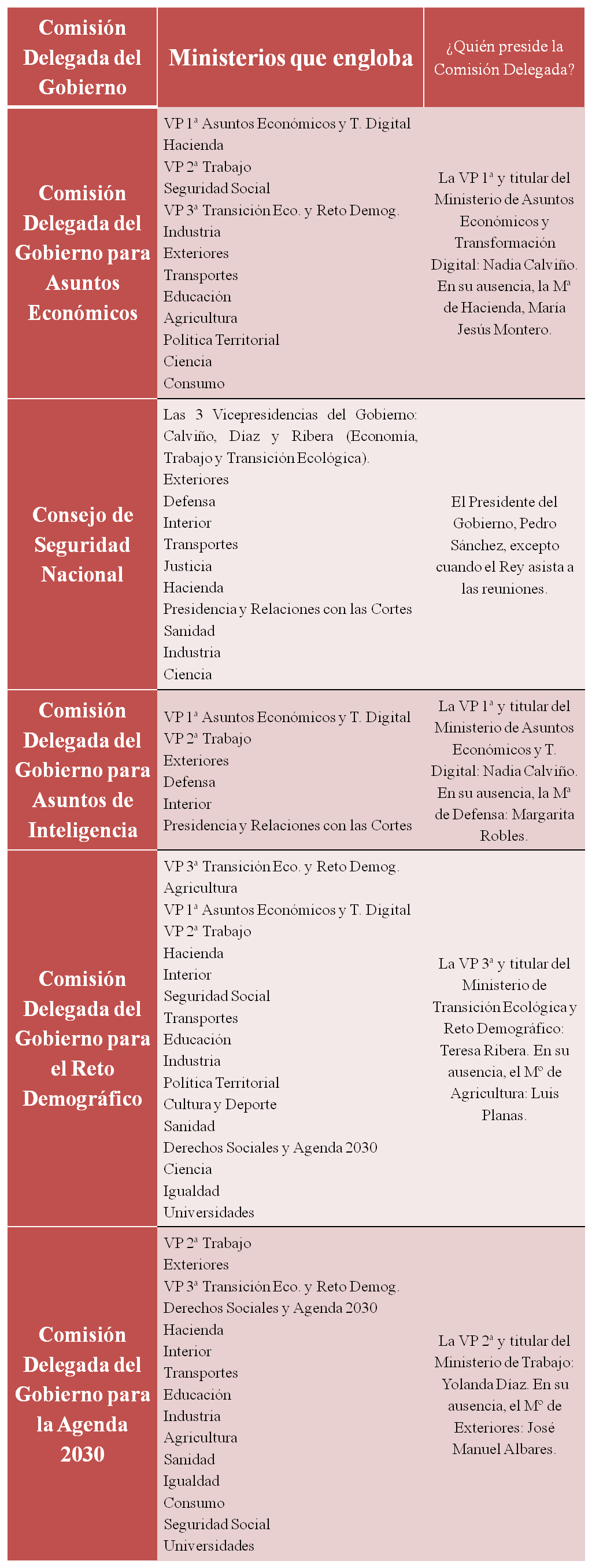 Actualmente existen cinco Comisiones Delegadas del Gobierno: Asuntos Económicos, Consejo de Seguridad Nacional, Asuntos de Inteligencia, Reto Demográfico y Agenda 2030. Al final del artículo incluiré una tabla explicativa que recoja qué Ministerios engloba cada una de las Comisiones Delegadas y quién preside las mismas. El Consejo de Seguridad Nacional, como Comisión Delegada que es, será incluido en la infografía, pero tiene unas peculiaridades en las que no entraré por cuestiones de espacio.